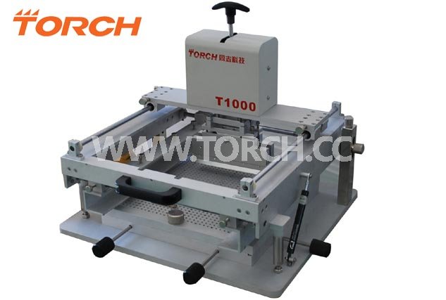 3、抬起印刷模板,取出PCB板,完成PCB板上焊盤的錫膏印刷過(guò)程。現(xiàn)有的全自動(dòng)印刷機(jī)中帶動(dòng)刮刀水平運(yùn)動(dòng)的傳動(dòng)裝置主要通過(guò)兩個(gè)相互平行的導(dǎo)軌配合高精密滾軸絲杠傳動(dòng),利用絲杠旋轉(zhuǎn)實(shí)現(xiàn)刮刀在水平方向的移動(dòng),其方式既有效保證了刮刀水平運(yùn)動(dòng)、平穩(wěn)運(yùn)行的要求,而且印刷出的焊點(diǎn)均勻、可靠;手動(dòng)印刷機(jī)一般采用橡膠刮刀,人工控制刮刀速度,角度和壓力。但是隨著電子行業(yè)的飛速發(fā)展,集成度越來(lái)越高的芯片不斷出現(xiàn),對(duì)印刷機(jī)的印刷精度提出的很大的挑戰(zhàn),特別是對(duì)于小型手動(dòng)印刷機(jī)來(lái)說(shuō),行業(yè)中還停留在“沙模鑄鋁”和“純手動(dòng)操作”階段,第一,平臺(tái)的問(wèn)題滿足不了高精密的絲網(wǎng)印刷,第二,純手工的刮刀操作,使刮刀的角度,刮刀的壓力,刮刀的移動(dòng)速度等都變得不可控,第三,精密印刷的一致性也不能保證,所以,T1000手動(dòng)精密印刷機(jī)的出現(xiàn),解決了上述在手動(dòng)印刷領(lǐng)域不能解決的問(wèn)題。T1000手動(dòng)精密印刷機(jī)的出現(xiàn),使電子廠僅僅用較低的成本就享受到了高昂的半自動(dòng)或者全自動(dòng)印刷機(jī)才有的功能,有效減低了生產(chǎn)成本,提高了印刷效率和印刷質(zhì)量。