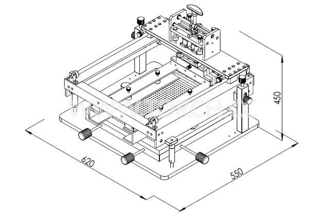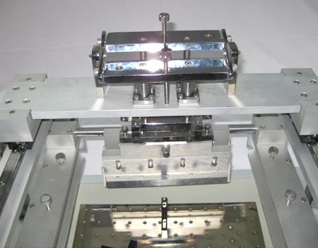 本機(jī)x、y、z和角度四軸都可以精密調(diào)整,通過(guò)調(diào)整四軸實(shí)現(xiàn)PCB板上的焊點(diǎn)和固定于模板框架上的模板相應(yīng)開孔坐標(biāo)的一一對(duì)應(yīng),并通過(guò)平臺(tái)的上升下降調(diào)整PCB和模板之間的距離。