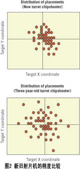 轉(zhuǎn)盤式射片機(jī)經(jīng)過較長時間的使用,由于零部件開始磨損,也會出現(xiàn)元器件拾取和貼裝精度問題。由于絲杠和凸輪表面開始磨合(或磨損),X-Y工作臺、轉(zhuǎn)盤貼裝頭、θ旋轉(zhuǎn)、帶盤絲杠之間的公差關(guān)系,基準(zhǔn)識別能力等等這些影響精度的因素相疊加,使得目標(biāo)貼裝或拾取點出現(xiàn)偏差。結(jié)果拾取和貼裝精度惡化(圖2)。這對于大的元器件可能不是什么問題,但當(dāng)貼裝0402、0201甚至01005無源元件時,它們就會帶來麻煩。