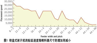 轉(zhuǎn)盤式射片機(jī)存在的固有問題,與以機(jī)器設(shè)計基本原理為基礎(chǔ)的速度和精度有關(guān)。隨著器件尺寸的變化,轉(zhuǎn)盤速度進(jìn)而貼裝率必須改變,以便與不同元器件和喂料器的結(jié)構(gòu)相適應(yīng)。盡管圖1看上去令人費解,實際情況可能還要糟糕。圖中表示出的一個使人迷惑的事實是,如果在轉(zhuǎn)盤上出現(xiàn)一個大的元器件,所有其它元器件的貼裝速度也必須慢下來;否則,貼裝的可靠性就會受到影響。實質(zhì)上,轉(zhuǎn)盤上的其他元器件都受最慢的元器件的處理速度控制。這種情況由于在大間隙機(jī)械傳動的帶盤喂料器上要求的多檢索作業(yè)而進(jìn)一步加劇,如圖1中凹陷的低谷部位所示。記住以下這點也很重要,傳統(tǒng)射片機(jī)主要受帶盤或散裝元器件供料的限制,這是柔性貼裝的關(guān)鍵影響因素。