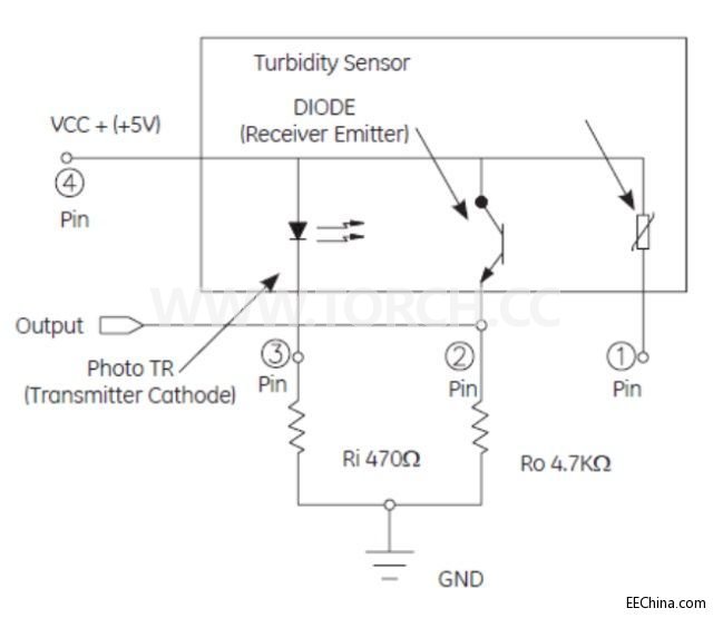 圖中所示的一體化光學(xué)濁度傳感器和濁度檢測(cè)模塊使用光電晶體管和二極管來(lái)測(cè)量光線在樣本液體中的傳輸。這種基本的傳感器非常適合家用電器使用,并且有助于降低能耗,比如檢測(cè)衣服何時(shí)干凈可以縮短洗衣時(shí)間。