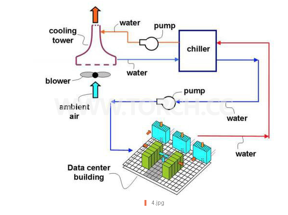 借由水冷系統(tǒng),IBM得以讓資料中心無需再使用空調(diào)。但為了ICECool計劃而開發(fā)的絕緣介電質(zhì)蒸汽系統(tǒng),也不需要使用冷卻器(右上)和冷卻塔(左上)